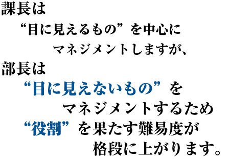 部長は、部門を大きく変革しながら経営をしていかなければならず、課長時代の殻を破る機会が必要です。