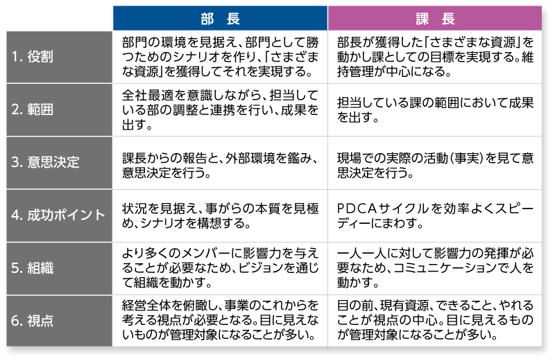 会社全体の目標や方針を考慮しながら、先が見通せない不確実な状況のなかで、部門経営と課長の育成を担っていく、これが部長の使命です。
