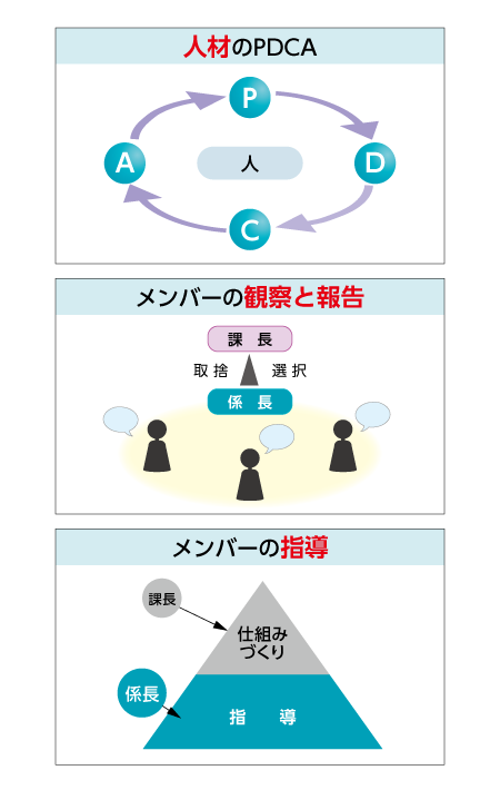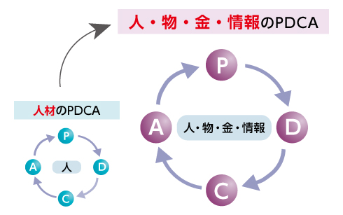課長の役割、それは人・物・金・情報といった経営資源を活用し、PDCAサイクルを回して課の目標を達成することです。